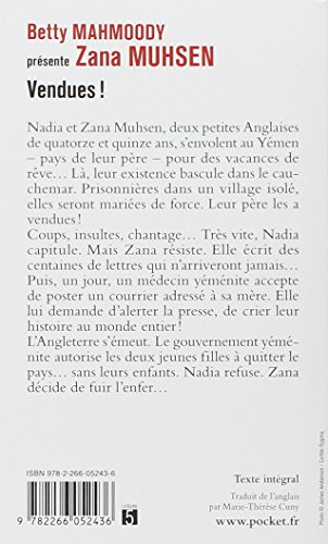 Bonne état général sauf a déplorer parfois l'usure de la jaquette, le jaunissement des pages, des taches sur les flans du livre et l¿écriture sur deuxième page n¿empêchement pas la lecture. Livre d¿époque Produit de bonne qualité. envoi sous 24h00 en enveloppe a bulles.Rang parmi les ventes Amazon: #37936 dans LivresMarque: PocketPublié le: 1993-04-30Sorti le: 1993-04-30Langue d'origine: FrançaisNombre d'articles: 1Dimensions: .59" h x 4.25" l x 6.97" L, Reliure: Poche337 pagesPrésentation de l'éditeurNadia et Zana Muhsen, deux petites Anglaises de quatorze et quinze ans, s'envolent au Yémen – pays de leur père – pour des vacances de rêve... Là, leur existence bascule dans le cauchemar. Prisonnières dans un village isolé, elles seront mariées de force. Leur père les a vendues ! Coups, insultes, chantage... Très vite, Nadia capitule. Mais Zana résiste. Elle écrit des centaines de lettres qui n'arriveront jamais... Puis, un jour, un médecin yéménite accepte de poster un courrier adressé à sa mère. Elle lui demande d'alerter la presse, de crier leur histoire au monde entier ! L'Angleterre s'émeut. Le gouvernement yéménite autorise les deux jeunes filles à quitter le pays... sans leurs enfants. Nadia refuse. Zana décide de fuir l'enfer...Biographie de l'auteurMarie-Thérèse Cuny a relancé le récit autobiographique avec des best-sellers. En 1988, elle a adapté de l'américain Jamais sans ma fille de Betty Mahmoody. Puis elle collabore avec Nathalie Schweigoffer dans J'avais 12 ans, avec Barbara Samson dans On n'est pas heureux quand on a 17 ans, Emmanuelle Laborit pour Le cri de la mouette et avec Phoolan Devi dans Moi, Phoolan Devi, reine des bandits. En compagnie de Pierre Bellemarre et de Jean-Marc Épinoux, elle écrit Les amants diaboliques : cinquante-cinq récits passionnément mortels. Elle a dernièrement collaboré avec Souad dans Brûlée vive.